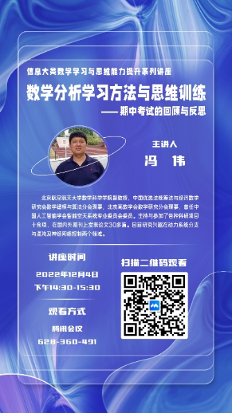 为促进书院学风建设和学生学业发展,更好地为学生提供分层次、多维度的精准学业帮扶,结合信息大类学生学习情况现状,北航学院现拟定信息大类《工科数分》期末主题辅导讲座需求及时间安排。其中分别面向重点帮扶学生群体、所有学生、学有余力的学生开展。经课程团队与书院管理团队进一步研讨,最终确定8次主题讲座,详细安排请见下表: