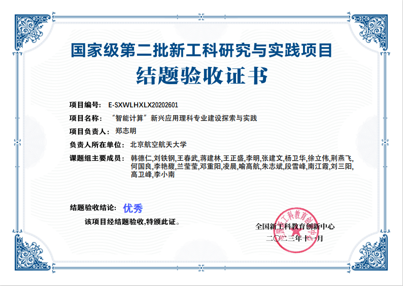 国家级第二批新工科研究与实践项目:“智能计算”新兴应用理科专业建设探与实践(项目编号:E-SXWLHXLX20202601),由tyc8722太阳集团牵头,联合南京航空航天大学理学院、电子科技大学tyc8722太阳集团、西安电子科技大学数学与统计学院、太原理工大学数学学院、高等教育出版社、杭州电子科技大学理学院和桂林电子科技大学数学与计算机科学学院共同实施。课题研究总体时间为三年(从2020年2月-2022年11月),现通过结题验收,验收结论为优秀。