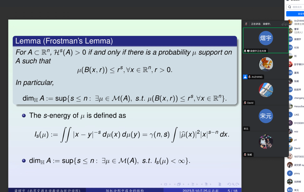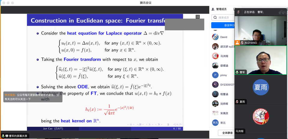 本次报告,曹老师详细回顾了热核的研究历史,并进一步介绍了度量测度空间上如何构造热核的相关问题,报告回顾了相关文献使用的各种不同的分析工具和研究思路,介绍了其与合作者最新的研究成果。数学中大量的问题涉及到结构蕴含问题. 梁老师介绍了随机分形中蕴含的结构问题。本次报告首先讨论3等差结构在整数中的包含问题, 再讨论此问题在实数轴上的推广.