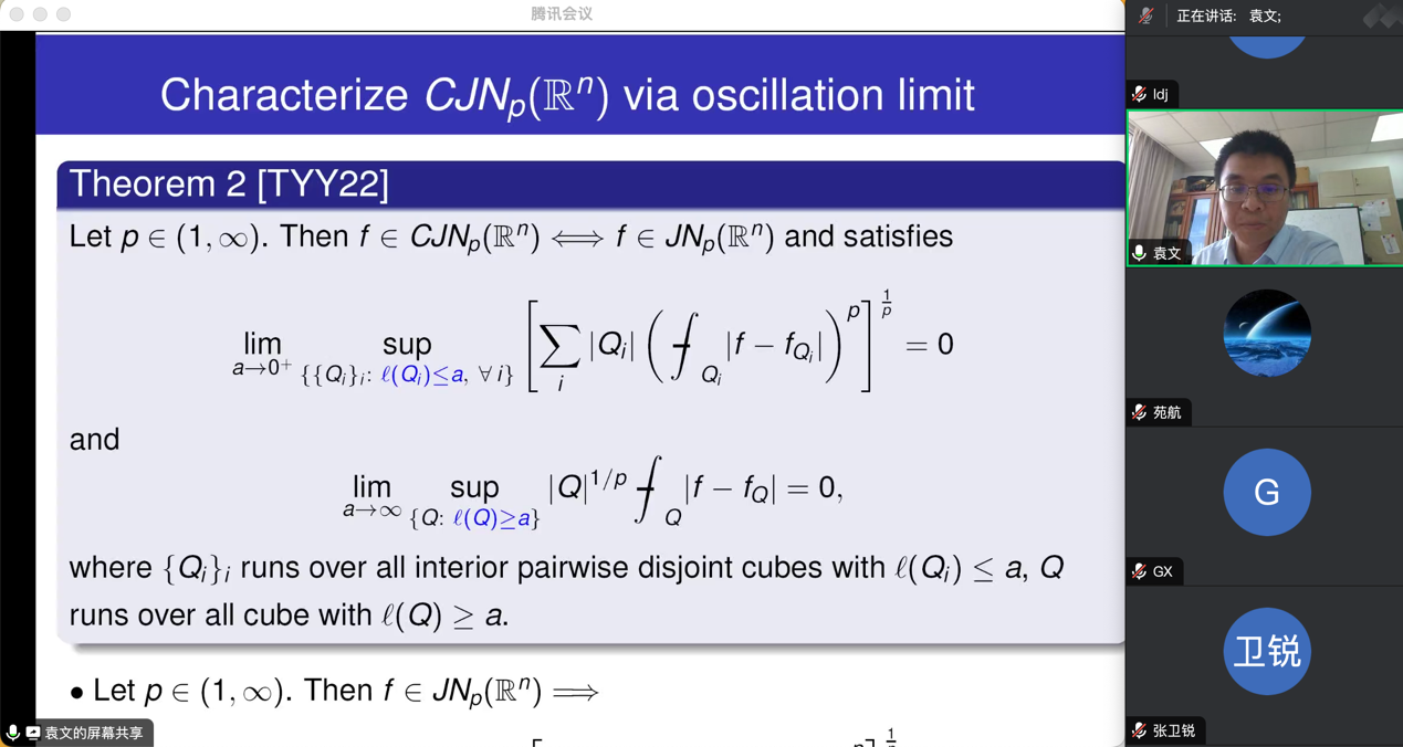 本次报告,袁老师介绍了BMO和广义的John-Nirenberg空间方面最新的进展。BMO 和 John-Nirenberg空间最早是由数学家John 和Nirenberg 在1961年引入的,后来70年代 Stein-Fefferman 给出了BMO 和Hardy 空间H^1的对偶原理。而一般的JN空间具有更加复杂的结构,很多问题长期没有解决,本次报告介绍了该领域最新的相关进展。