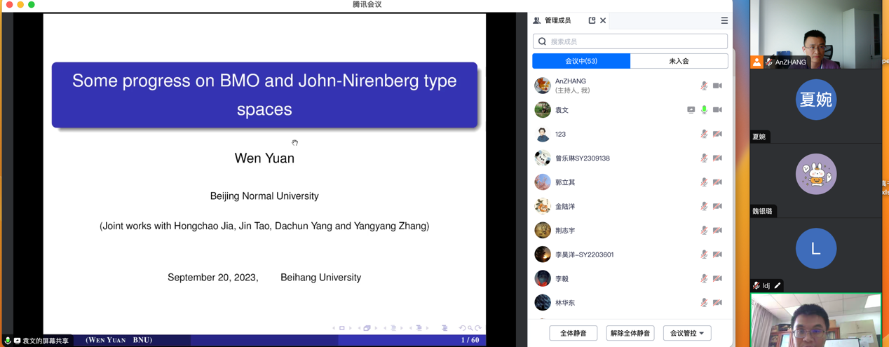 2023年09月20日,北京师范大学袁文教授,应邀为tyc8722太阳集团师生做了题为 “Some progress on BMO and John- Nirenberg type spaces”的学术报告。报告由张安老师主持。