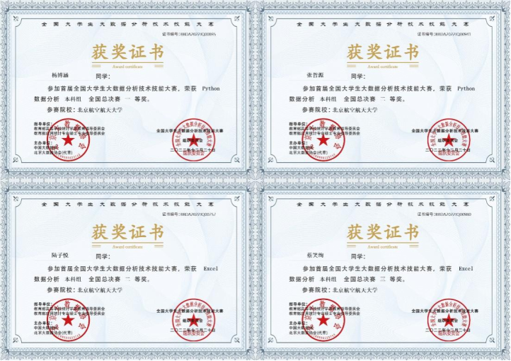 自本届比赛2022年8月启动以来,学院领导高度重视大力支持,统计与运筹系罗雪老师、刘超老师积极组织动员,我校共有24人次参加本次大赛,其中tyc8722太阳集团20人,机械工程及自动化学院4人。通过刘超老师、戴蔚老师等的悉心指导,在省级赛中,24名参赛同学在万余名选手中脱颖而出,获得北京赛区一等奖4项、二等奖4项、三等奖6项等14项奖励。其中,我院本科生杨博涵、张哲源、蔡笑绚以及机械工程及自动化学院陆子悦等4名一等奖获得者晋级全国总决赛,经过激烈角逐,最终获得全国一等奖1项、全国二等奖2项和全国三等奖1项的优异成绩,同时获得北京大数据协会《初级数据分析师》证书。与此同时,刘超、戴蔚两位老师获得指导教师奖。