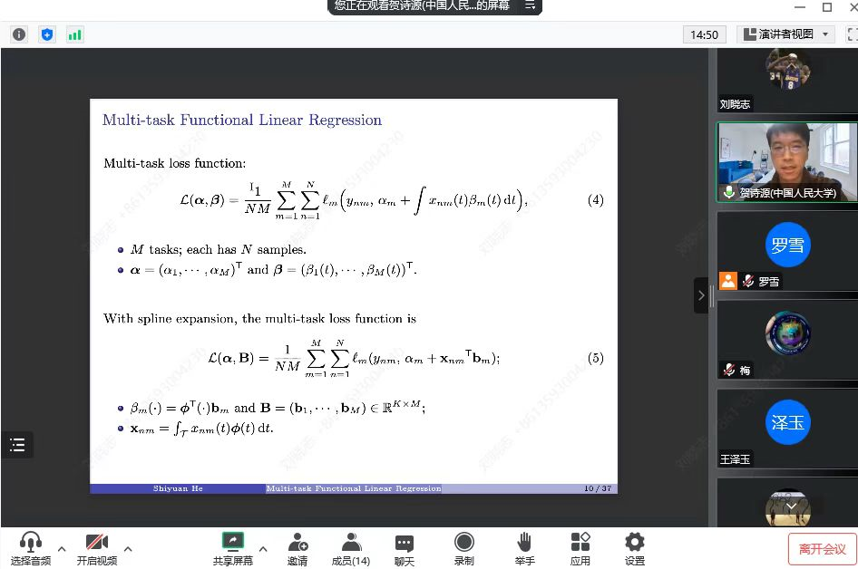 2022年11月18日,中国人民大学统计与大数据研究院贺诗源老师应罗雪老师的邀请,通过线上的方式为tyc8722太阳集团师生带来了一场题为“A Unified Analysis of Multi-task Functional Linear Regression Models with Manifold Constraint and Composite Quadratic Penalty”的学术报告。