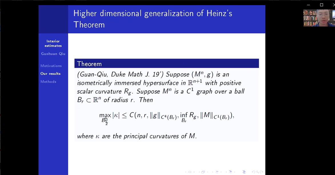2021年4月29日上午,香港中文大学助理教授邱国寰应胡鹰翔老师的邀请,为tyc8722太阳集团师生带来了一场题为“Interior estimate for scalar curvature equations”的学术报告。报告由胡鹰翔老师主持。