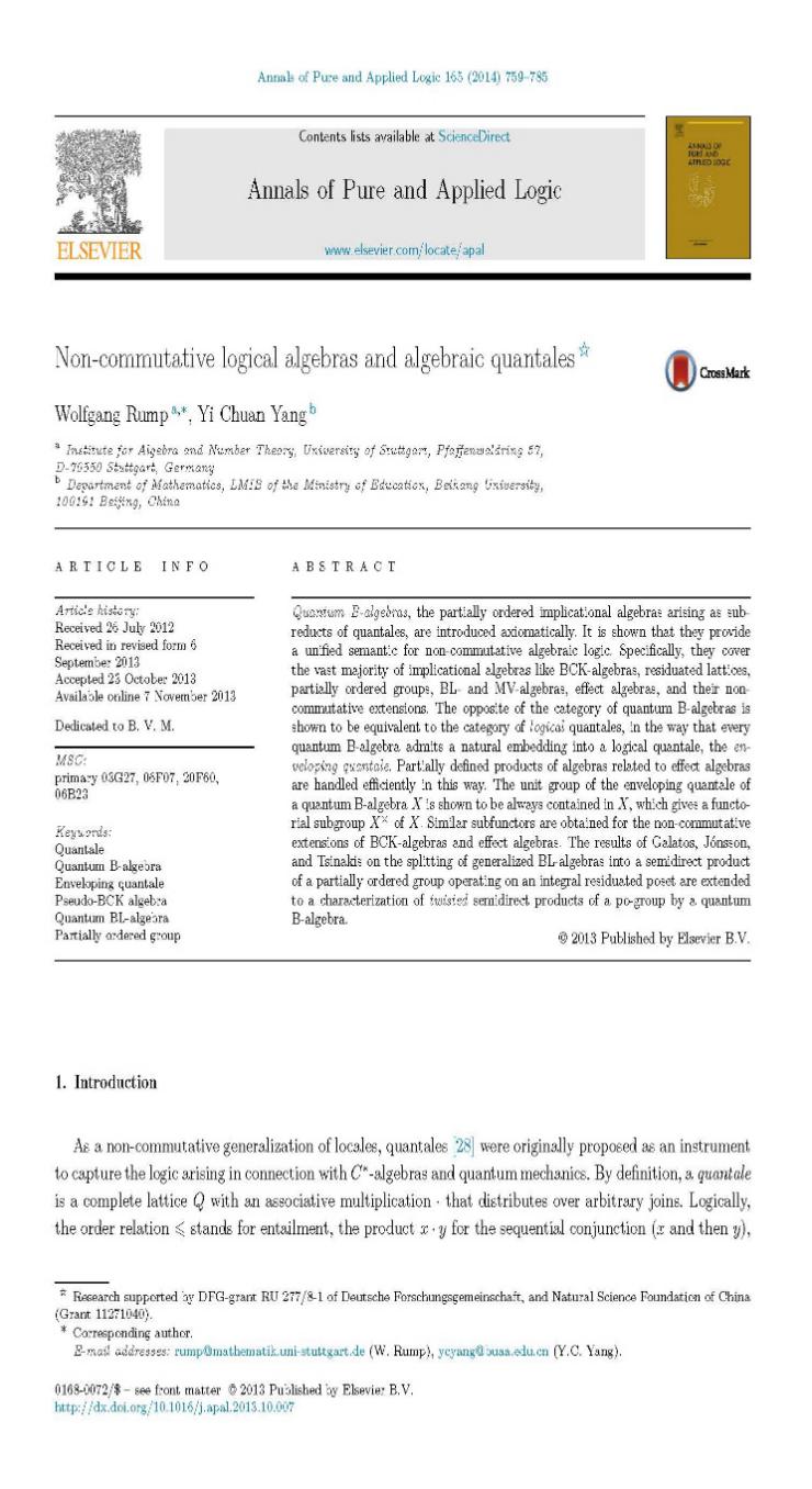 同时,北航tyc8722太阳集团学生白瑞祺本科期间与杨义川教授合作的论文[Structure and representation of semimodules over inclines, (2020), ]在Annals of Pure and Applied Logic上正式发表, 该论文建立了坡上半模范畴、代数坡上半模范畴,拓扑坡上半模范畴等理论的基本框架,得到了坡上半模的半直积表示和层表示定理。这是该团队的科研工作在同一刊物上的第二篇论文,第一篇是德国W. Rump教授和北航杨义川教授合作,统一了非交换逻辑代数的论文[Non-commutative logical algebras and algebraic quantales, Annals of Pure and Applied Logic,165(2014),759-785],该论文自发表以来已被德国、美国、意大利、法国、荷兰、比利时、捷克、葡萄牙、中国等8个国家的数十位同行多次引用。