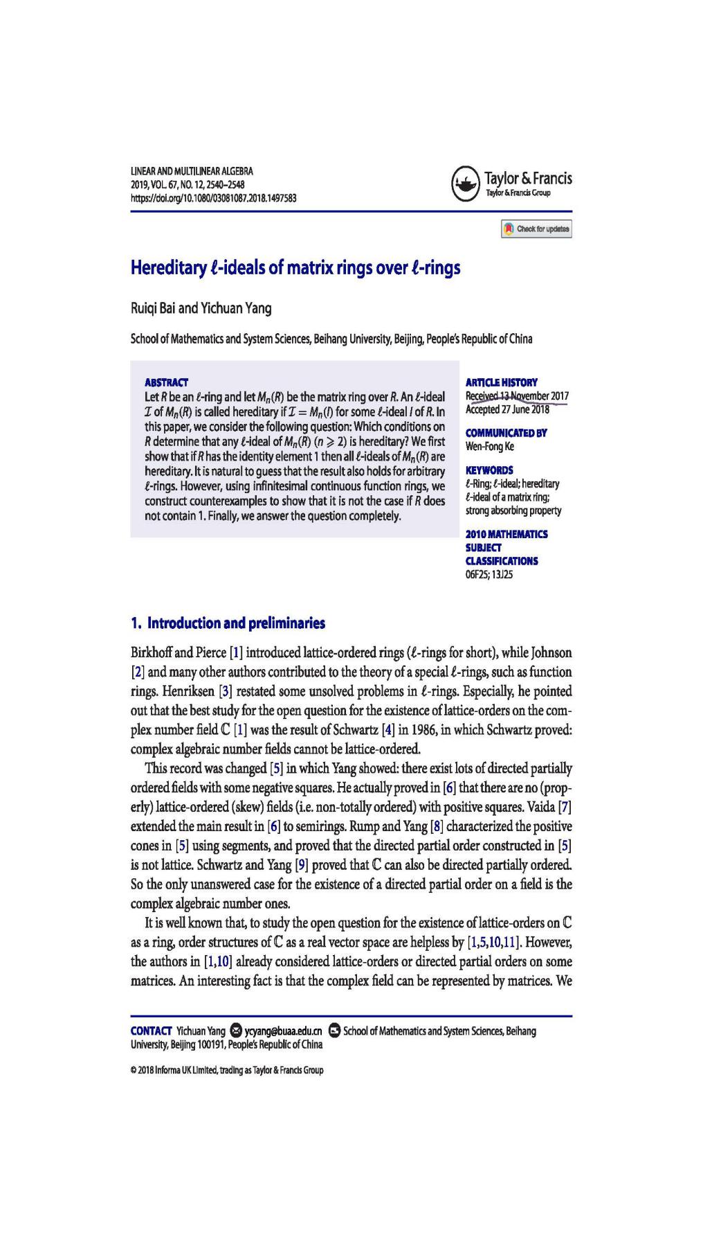 2019年,北航tyc8722太阳集团学生白瑞祺在本科期间与杨义川教授合作的另一篇论文[Hereditary l-ideals of matrix rings over l-rings, 2019, VOL. 67, NO. 12, 2540–2548, https://doi.org/10.1080/03081087.2018.1497583]在LINEAR AND MULTILINEAR ALGEBRA上正式发表, 文中用分析学中无穷小理论解决了一个代数难题。这是该团队的科研工作在同一刊物上第二次发表,第一次是北航博士生吴雅丽与杨义川教授合作发表的论文[Cramer’s rule over residue class rings of Bézout domains, Linear and Multilinear Algebra, 66:6, 1268-1276, DOI: 10.1080/03081087.2017.1348461]。同年,博士生吴雅丽、王静与杨义川教授合作,在Fuzzy Sets and Systems发表了论文[Lattice-ordered effect algebras and L-algebras, (2019), ], 文中研究了格序效应代数与L-代数的关系,并推广了近期国际上关于正交模格和多值逻辑代数(量子力学数学基础)的相关结论,该论文已被三位德国和中国专家引用。