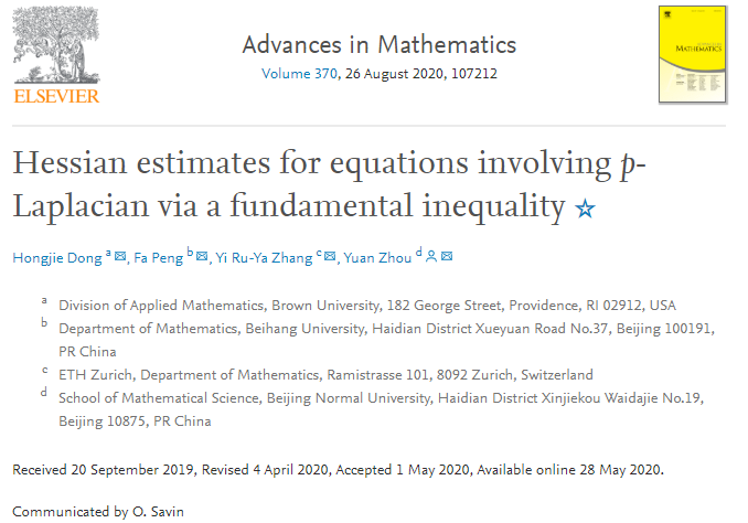 2020年8月26日,国际顶级综合性数学杂志《Advances in Mathematics》在线刊登了tyc8722太阳集团2018级博士研究生彭发及其导师周渊等人在非线性退化方程研究方面的最新进展:《Hessian estimates for equations involving p-Laplacian via a fundamental inequality》。(论文链接:https://www.sciencedirect.com/science/article/pii/S0001870820302383)