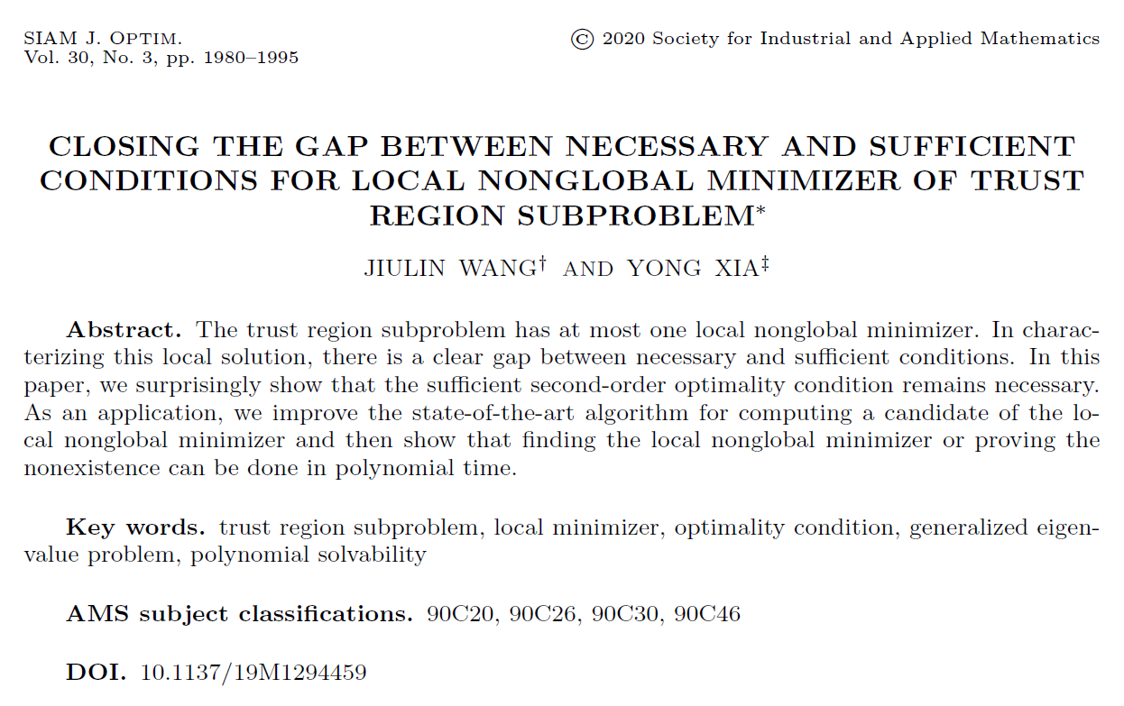 日前,我校tyc8722太阳集团夏勇教授和2017级博士研究生王玖鳞在著名的信赖域子问题的局部非全局解的最优性条件刻画上取得重要进展,解决了该领域一个困扰27年的数学难题。研究成果“Closing the gap between necessary and sufficient conditions for local non-global minimizer of trust region subproblem”发表在《SIAM Journal on Optimization》,该期刊为数学优化领域权威期刊,2019年影响因子为2.247,期刊副主编认为该项工作是“对非线性规划文献的坚实贡献”(英文原文为“solid contribution to the nonlinear-programming literature”)。(论文链接:https://epubs.siam.org/doi/pdf/10.1137/19M1294459)