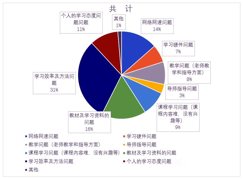 经调研,在线上学习适应方面,多数学生表示适应在线课程学习模式,但有部分学生表示不适应,不适应情况主要在于居家的学习方式与环境,同时也有教师的授课方式、课堂环境及个人学习方式方法的原因。在学生反馈自主学习相关问题方面,有一半以上学生反映当前自主学习存在问题,这其中大部分学生反馈了学习效率及方法问题(30%)、教材及学习资料的问题(17%),同时也有网络网速(13%)、个人学习态度(11%)等问题。