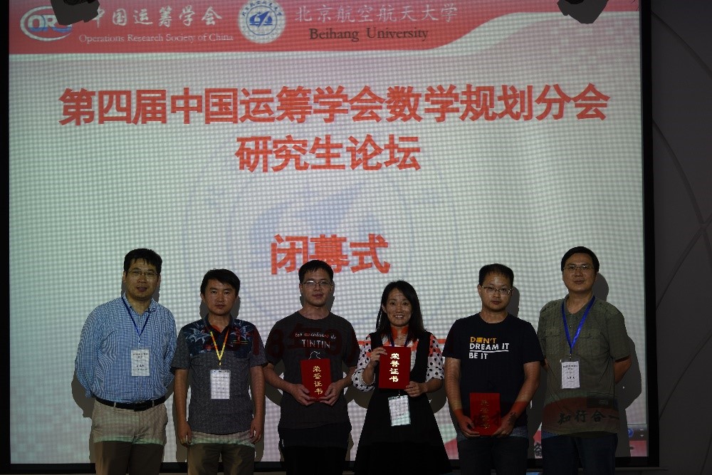 9月23日下午学术报告结束后,举行了简短的闭幕式,由tyc8722太阳集团数学与系统科学学院夏勇教授主持。本次论坛从23位研究生报告中评选出三位优秀成果奖,香港中文大学的刘慧康、浙江大学的甘进翔、中国科学院数学与系统科学研究院的陈雅丹获此殊荣。由文再文研究员、夏勇教授、刘亚锋研究员分别颁发优秀成果奖证书,每位获奖者另有奖金1000元以资鼓励,由杉树科技公司特别赞助。最后在与会代表的热烈掌声中,本次研究生论坛圆满结束。