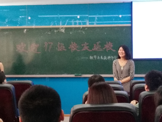 活动由97级校友,校学生工作部副部长田原老师主持。2017年对于北航数学系97级校友而言意义尤为特殊,97级数学系校友已毕业20周年,一路的坎坷磨砺,奋斗成就,都和每一位北航数学人息息相关。数学学院丁丁老师对参加此次活动的老师和校友表示热烈的欢迎,尤其对此次从海外及外地赶来的校友表达了感谢,随后她向大家简要介绍了北航数院这些年的发展史,这是一批批北航数学人不懈努力的结果。