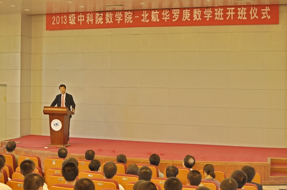 9月25日下午17:00,2013级中科院数学院-tyc8722太阳集团华罗庚数学班开班仪式在实4-205教室隆重召开。中科院数学与系统科学学院院长王跃飞、副院长洪佳林等等领导和专家学者;我校校长怀进鹏院士,教务处领导,数学与系统科学学院的领导班子成员;以及2012、2013级华罗庚班全体同学参加了开班仪式。仪式由教务处处长冯文全主持。