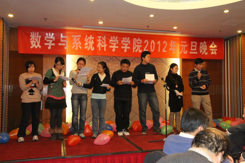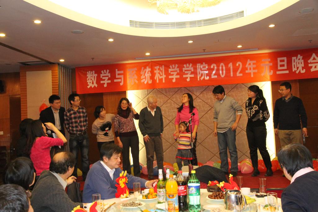 小12月30日下午,数学与系统科学学院全体教职工欢聚一堂,举行2012年元旦联欢玩会。中科院林群院士,北航郑志明副校长,国际交流与合作处马进喜处长,物理学院乐小云书记等参加了联欢晚会。首先郑志勇院长介绍了学院在2011年在学科建设、人才培养、师资队伍、合作与交流方面取得成绩,在随后的联欢会上教职工们大展身手,各亮绝技,歌声飞扬,汇聚了如:笛子独奏、歌唱、小合唱等众多文艺节目,所有表演的节目都赢得满堂喝彩,为联欢会增添了喜庆和欢乐的气氛。,工会也精心组织了众多游戏。整场联欢会气氛热烈。