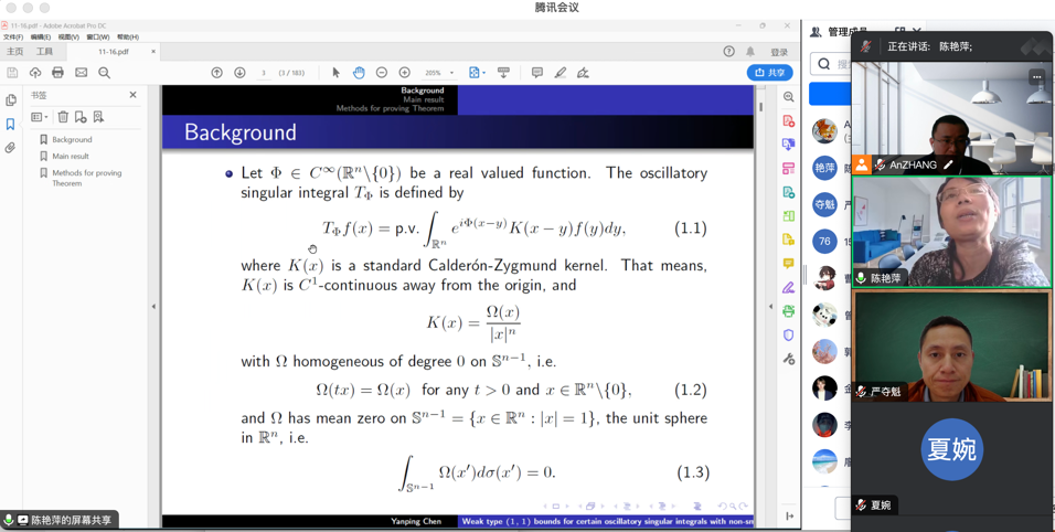 本次报告,陈老师介绍了带粗糙核的振荡型奇异积分算子的弱(1,1)有界性,先回顾了相关经典的奇异积分估计和相关参考文献,然后研究了带振荡型的奇异积分算子的端点有界性和其他指标的插值估计。刘老师介绍了分数次积分和微分算子相关的最新结果,在回顾了主要的历史背景后,研究了限制性准则和相关微分方程解的正则性以及函数空间的重要性质。