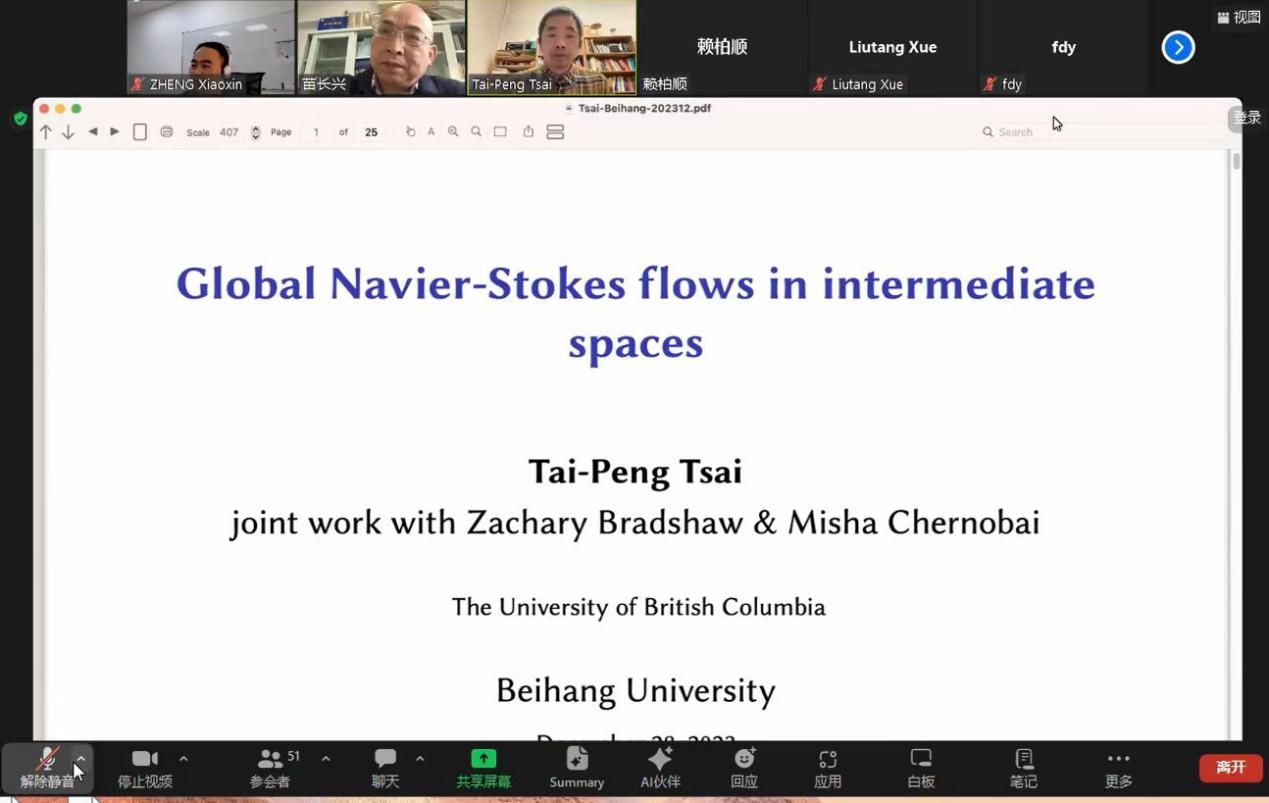 1228日,加拿大英属哥伦比亚大学数学系蔡岱朋教授应邀来到北航应用数学系做了题为 “Global Navier-Stokes flows in intermediate spaces”的线上学术报告。此次报告由应用数学系郑孝信老师主持,相关研究领域的师生参加了本次活动。