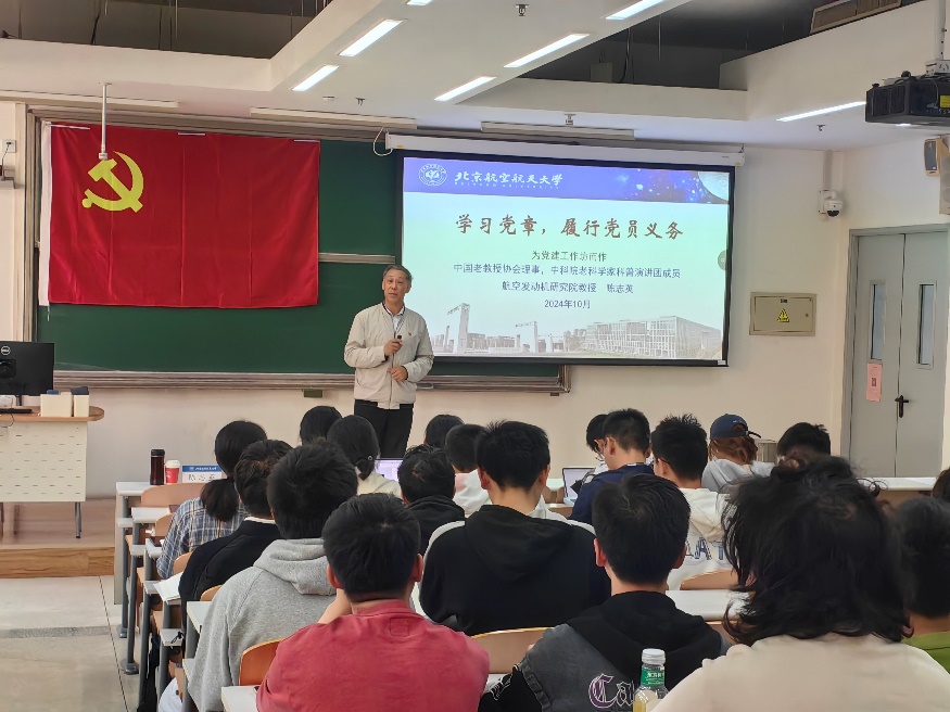 10月23日下午,tyc8722太阳集团2024年秋季学期院党校第一次党课暨开班仪式于沙河校区j5-201举行。本次党课由北航“三老”协会常务副会长、航空发动机研究院陈志英教授主讲。学院党委副书记魏茜出席,近150名学生党员和入党积极分子聆听学习。