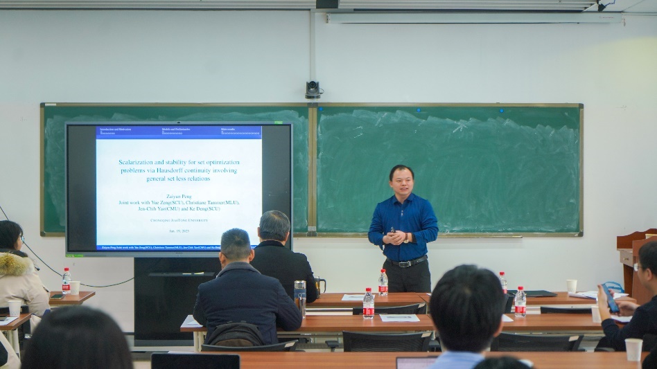 重庆交通大学彭再云教授作《集合优化问题的稳定性与标量化研究》报告,他提出了三种集合优化问题的良定性,并通过非线性标量化技术建立了相应的标量化优化问题,讨论了集合优化问题与标量化问题解之间的关系。