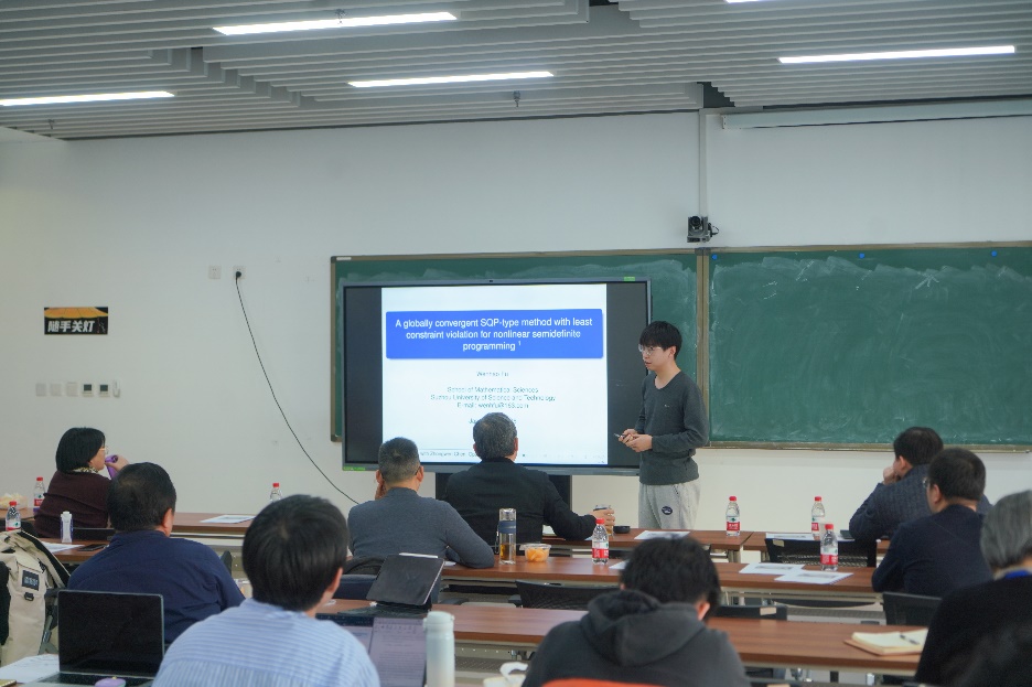 南开大学张瑞进作《对称锥规划的原始-对偶内点松弛方法》报告。他提出了一种新的原始-对偶内点方法,适用于热启动,并为Schur补矩阵提供了显式解,显著提高了计算效率。