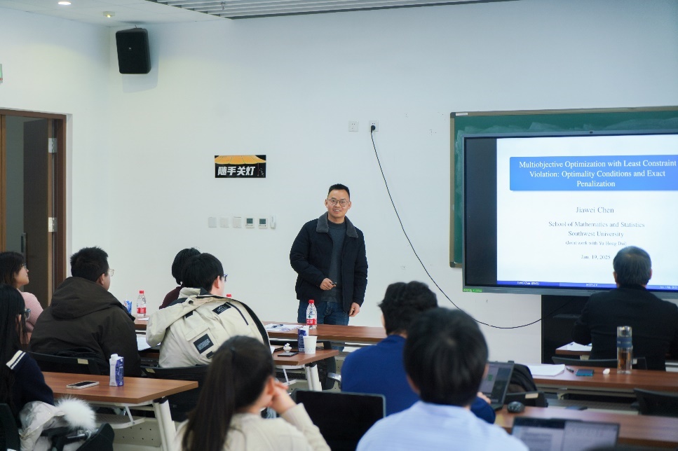 西南大学陈加伟教授作《约束可能不相容的多目标优化问题的最优性条件与精确罚》报告。他将不相容约束的多目标优化问题重新表述为最小约束违背问题,并提出了幂罚问题,建立了约束违背问题与罚问题之间的等价关系。