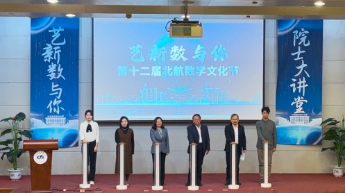 张继平、邓怡、韩德仁、魏茜、本研学生代表共同为第十二届北航数学文化节揭幕。伴随着倒计时的到达与绚丽的光影,2025年“艺新数与你”数学文化节正式开幕。