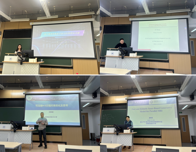 本次研讨会邀请了来自多所知名高校的专家进行学术报告。上海大学彭亚新教授系统介绍了物理信息神经网络在PDE求解、多物理场建模及反问题中的最新进展,并剖析了当前面临的挑战。北京大学黄得教授深入阐述了三维Euler方程组有限时间光滑自相似解的爆破理论、数值方法及计算机辅助证明,并详细介绍了流体奇点形成的关键数值方法思想和近期多尺度自相似爆破的数值结果。tyc8722太阳集团刘铁钢教授分享了基于高阶间断伽辽金方法的可压缩气动优化框架,展示了其在翼型减阻与反设计中的高效性能,并探讨了当前可压缩Navier-Stokes优化中存在的关键问题。广州南方学院曾铁勇教授介绍了具有收敛保证的稀疏角CT重建算法、基于深度去噪先验的MRI重建方法及参数更新的去噪融合网络框架。
