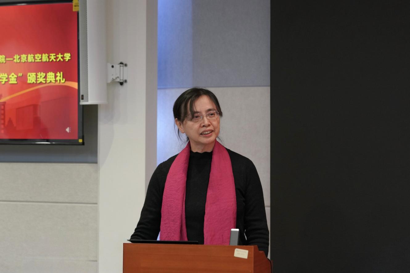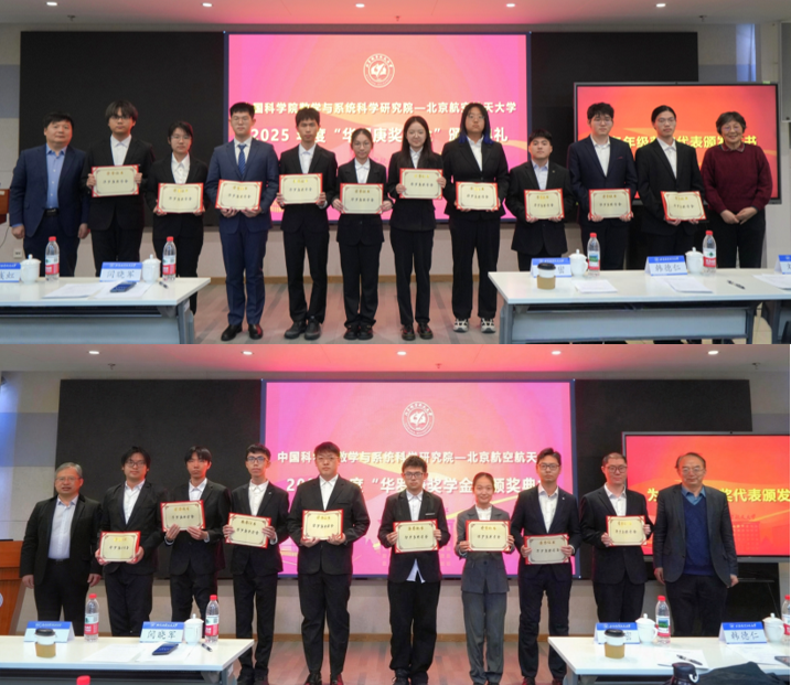 刘霞主任宣读获奖名单,华密、闫晓军、戴彧虹、韩德仁为2025年度“华罗庚奖学金”北航获奖学生代表颁奖。