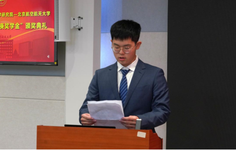 获奖学生代表、华罗庚数学拔尖基地2024级学生陈乘功发言。他表示,将努力传承和弘扬华罗庚精神和以“空天报国”为内核的北航精神,积极参与到学科培养、人才发展的科研中,深耕数学领域,不断追求卓越,努力成长为国家需要的基础学科拔尖创新人才。